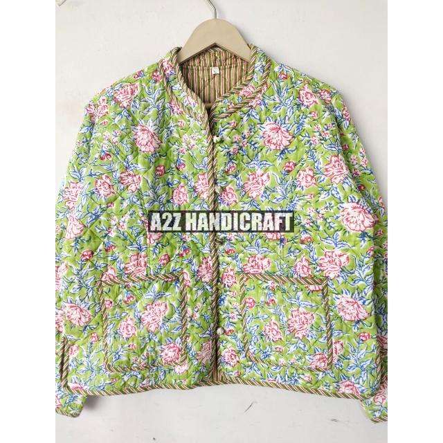 Vintage Bohemian Autumn Women's Floral Short Quilting Jacket Hand Block Printed Indian Cotton Stripe Pocket Quilted Coat Gift