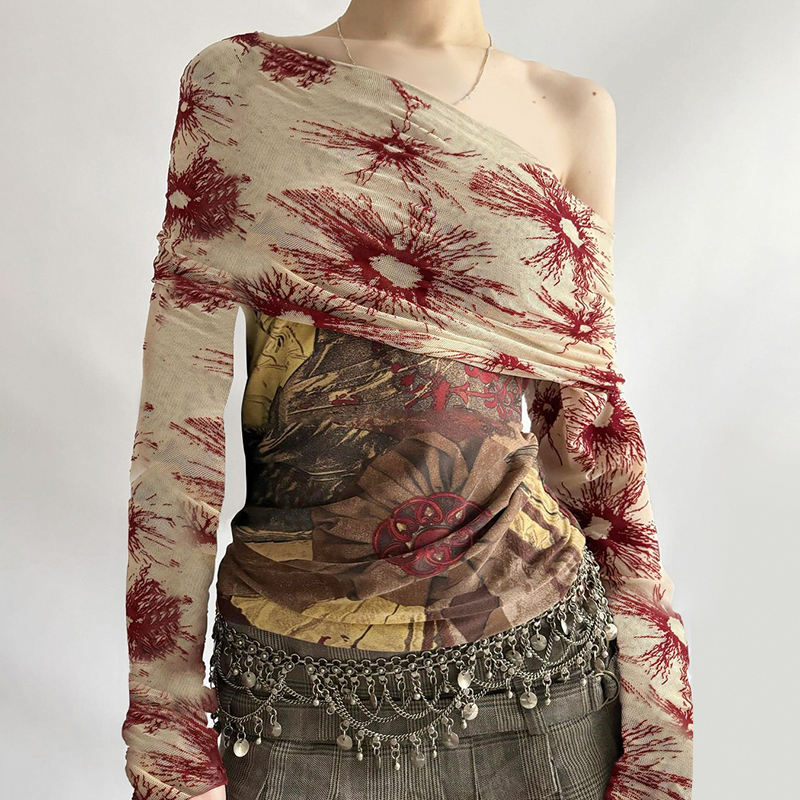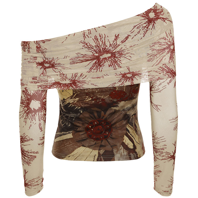 Top vintage bohème à imprimé floral numérique, épaules dénudées, avec panneaux en maille transparente - Pull en tricot