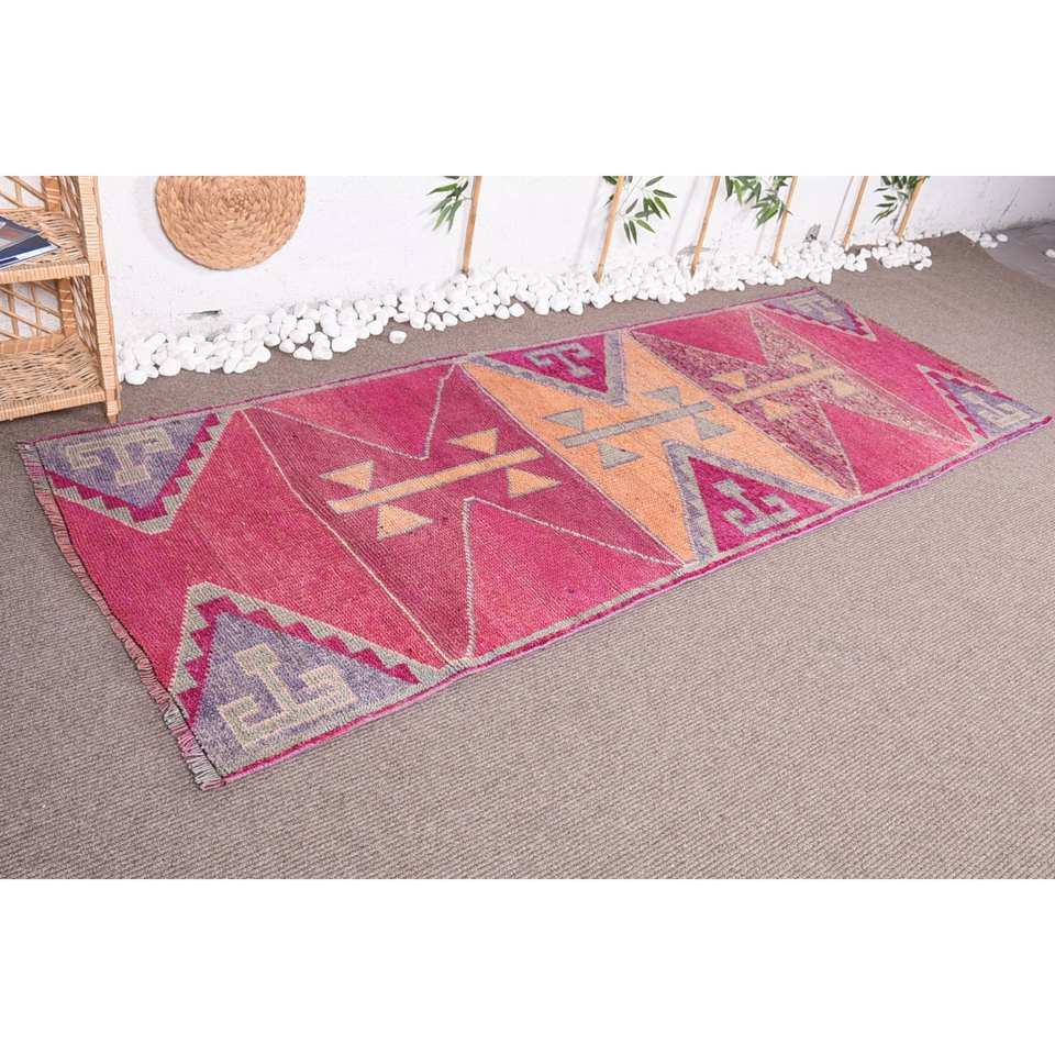 Tapis Vintage Bohème Laine 3.2X8.9 pieds Écologique Pile Moyenne Rose et Orange Géométrique Patchwork Design Latex Support