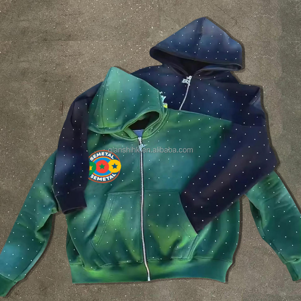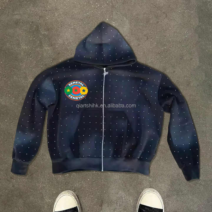 Sweat à Capuche Brodé Vintage Boxy Printemps Personnalisé Surdimensionné Lavage à l'Acide Sweat à Capuche à Fermeture Éclair Unisexe Poids Lourd Strass Sweat à Capuche avec Fermeture Éclair