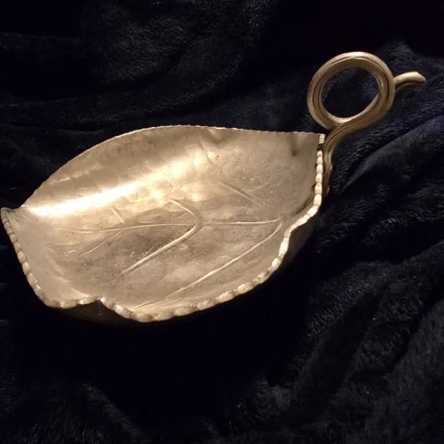 Vintage Buenilum Hand Hammered Aluminum Leaf Shaped Serving Dish Tray Trinket Bowl with Stem Handle Tray