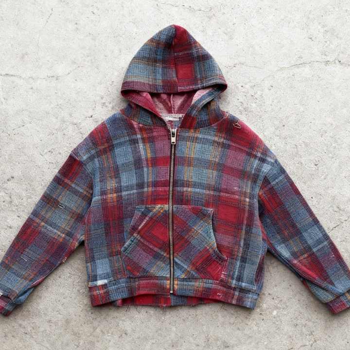 Hoodie vintage personnalisé en coton délavé, coupe courte, patchwork à carreaux, épaules tombantes, avec col à capuche zippé intégral en tissu épais
