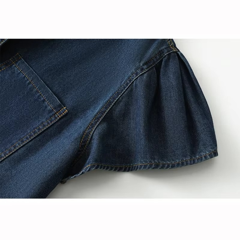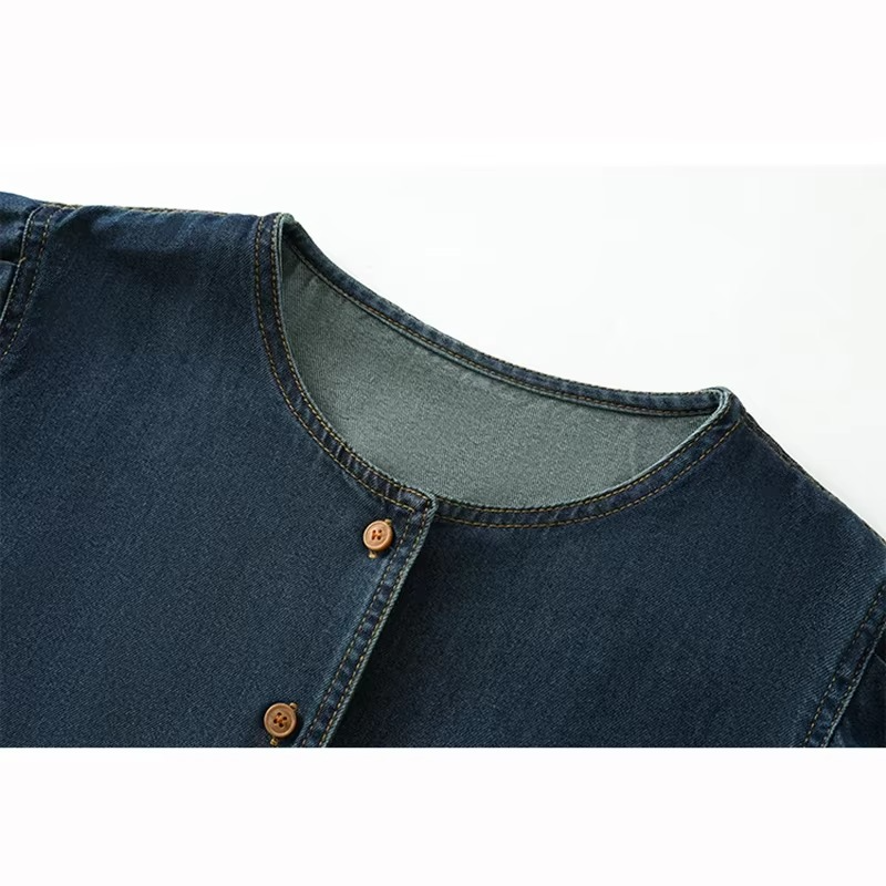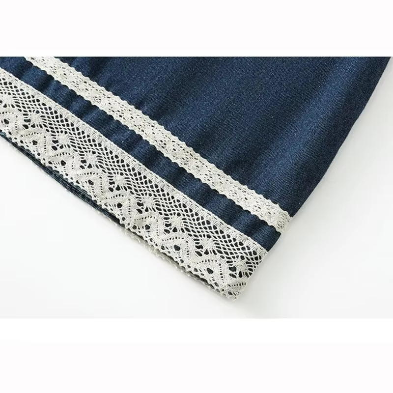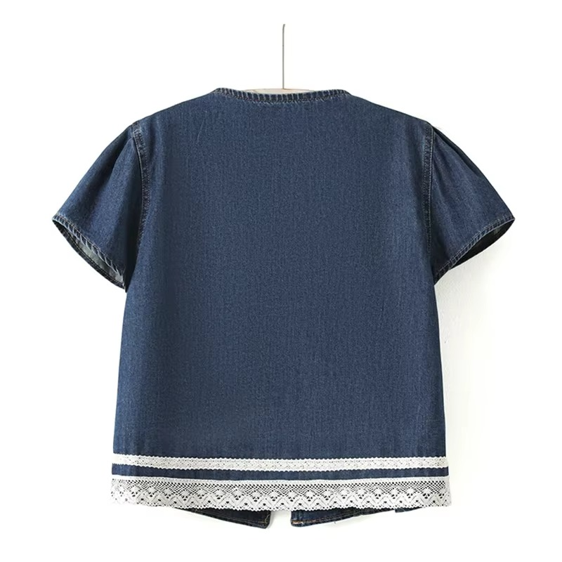 Vintage Dark Blue Thin Short Denim Jacket Women Summer New Big Pocket Lace Patchwork Round Neck Short Sleeve Jeans Jacket Coat