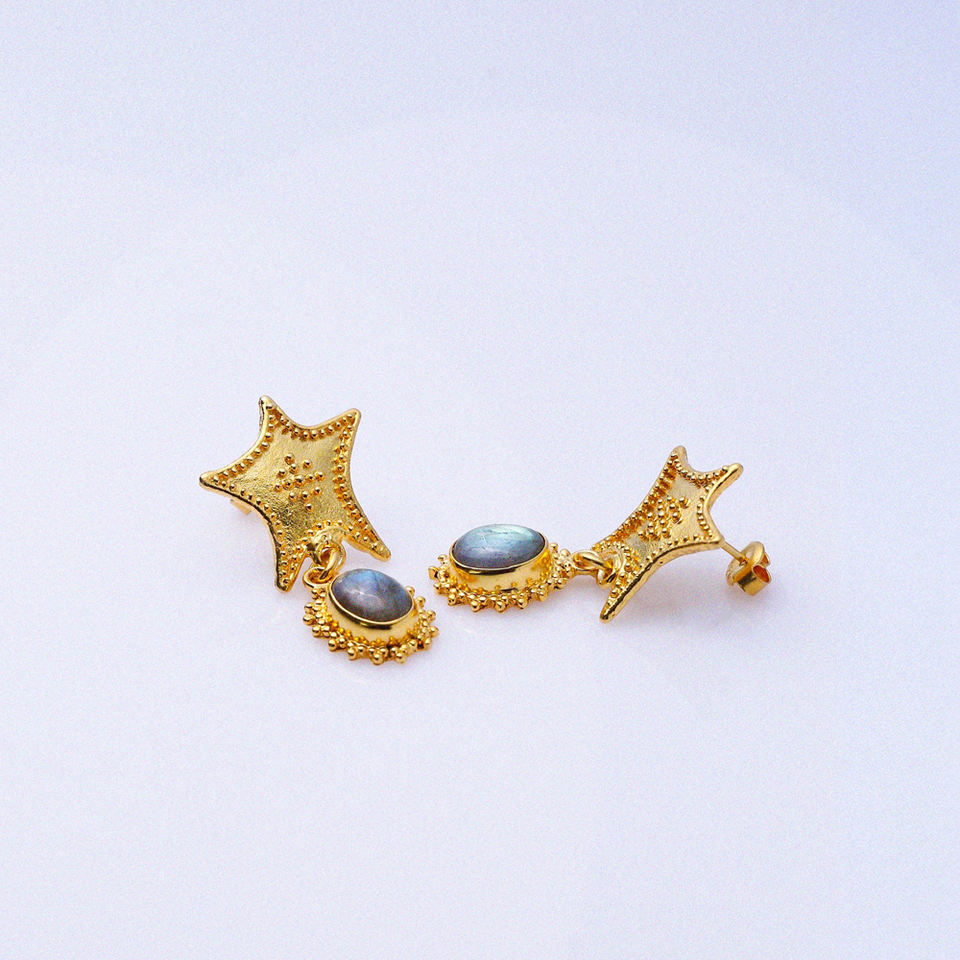 Boucles d'oreilles en forme d'étoile de mer, pierre labrodite design vintage, crochet en or 22 carats, argent sterling 925, vente en gros de bijoux turcs faits à la main