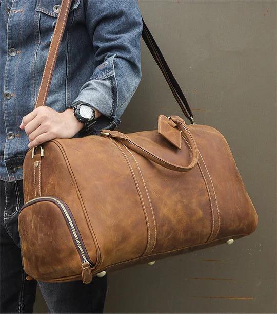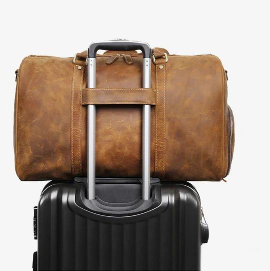Vintage Genuine Leather Duffel Bag Large Capacity Reusable Zipper Closure with Shoe Compartment for Weekend Overnight Travel