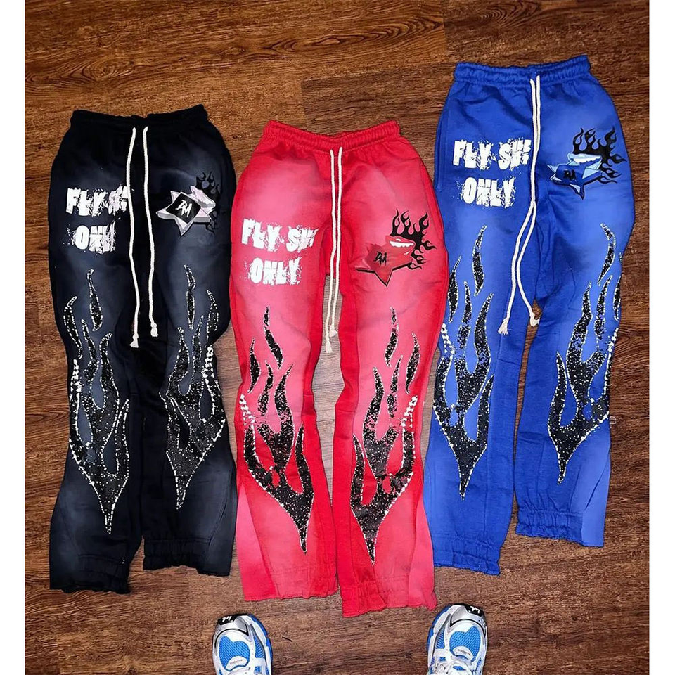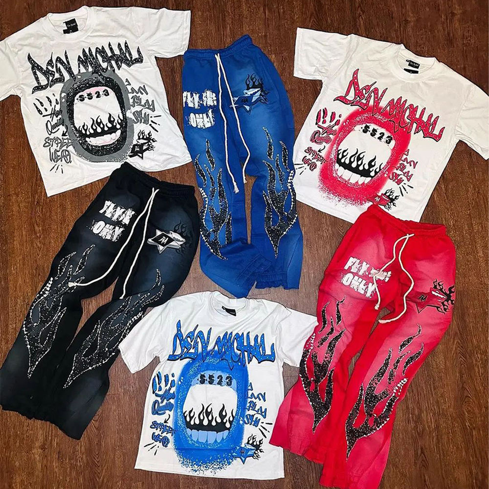 Vintage Graphic Flame Print Breathable 100% Cotton T-Shirt Pants Set Streetwear Urban Casual Matching Outfit Lightweight