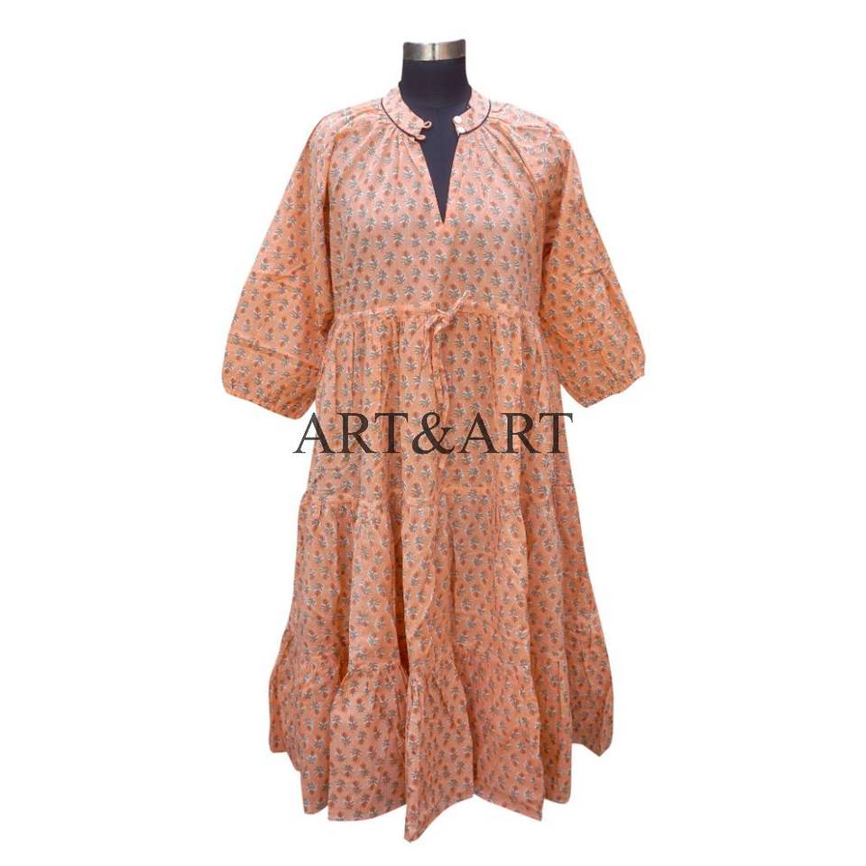 Vintage Hand Block Printed Summer Cotton Career Dress Floral Print Three Quarter Sleeves A-Line Breathable Midi Wrap Dress Made