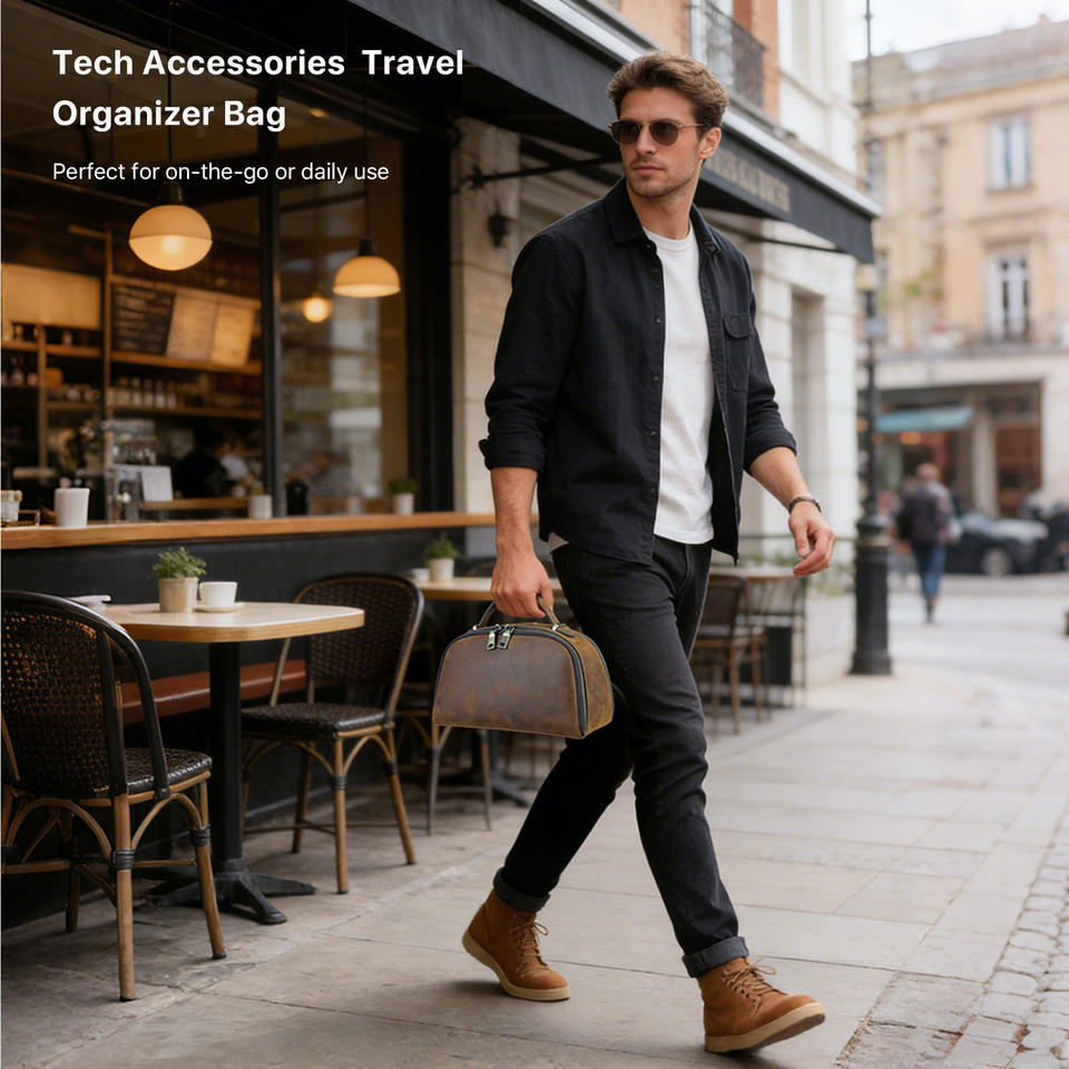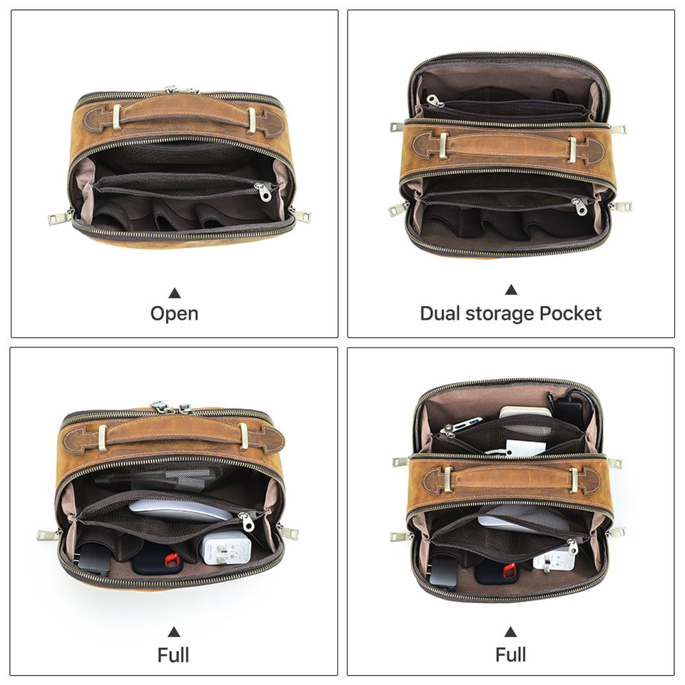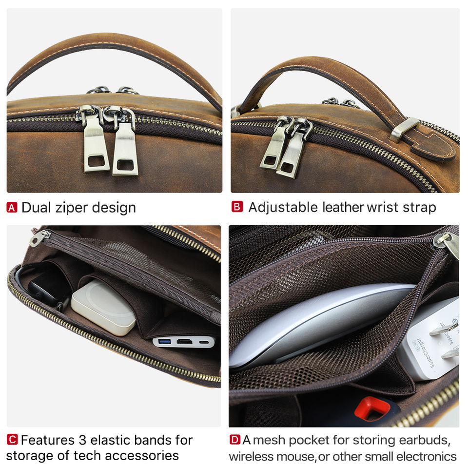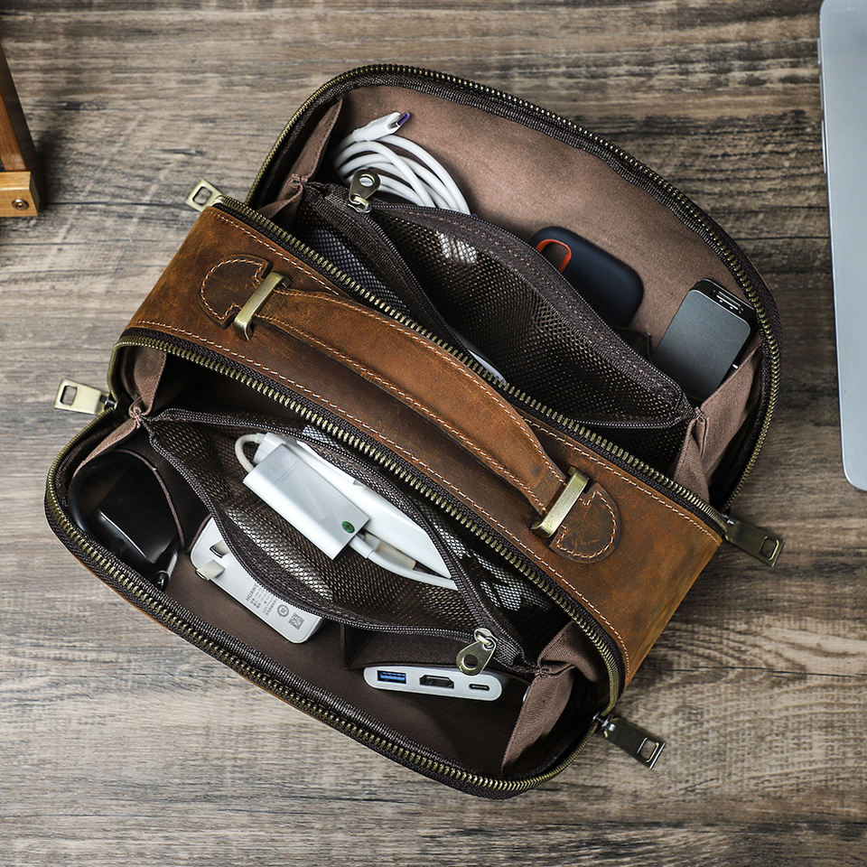 Pochette de voyage vintage en cuir de vachette véritable, à double fermeture éclair, grande capacité, pour organiser les appareils électroniques EDC