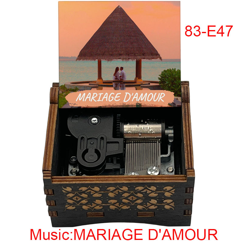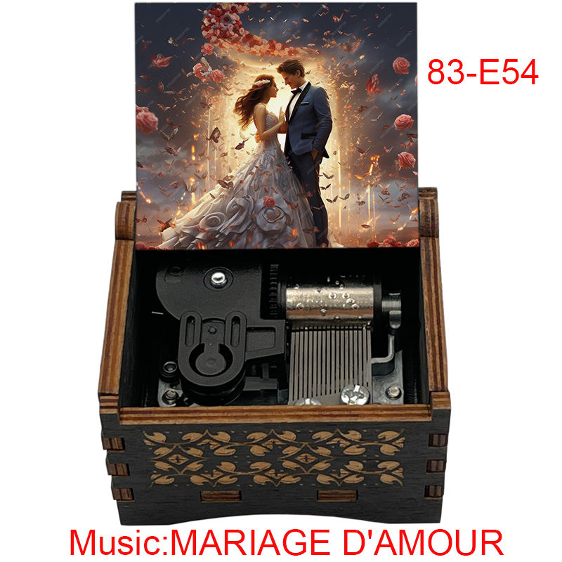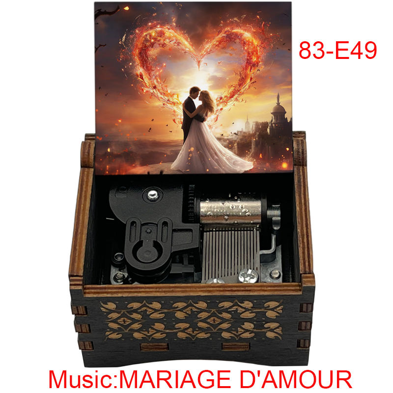 Boîte à musique vintage artisanale créative mini carrée MARIAGE D'AMOUR en bois sculpté à manivelle pour la décoration intérieure