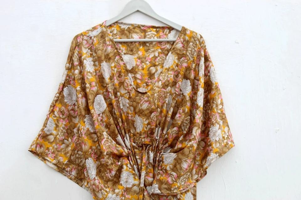 Robe de bain en mousseline de soie Upcycle vintage faite à la main Robe de soirée d'été de luxe à manches longues et col en V pour femmes