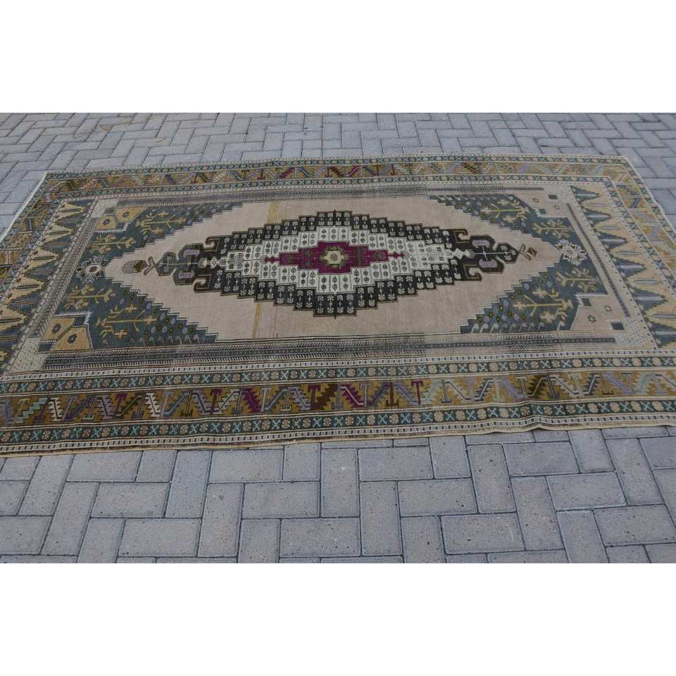 Tapis turc vintage de grande surface en laine à motif abstrait beige et bleu de 5.3x9.4 pieds avec support en latex pour chambre d'ado