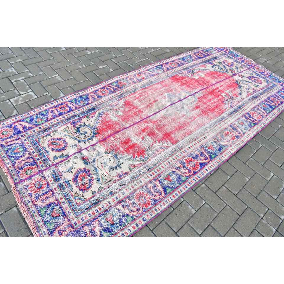 Grand tapis vintage 4,3x9,9 pieds, tapis turc rouge en laine persane