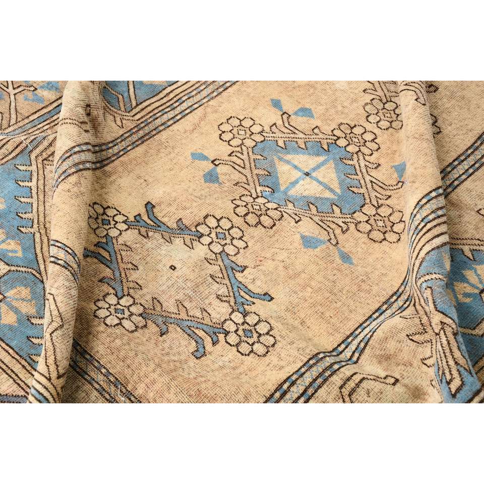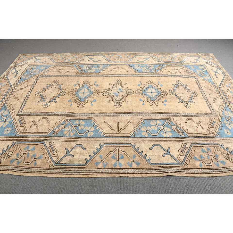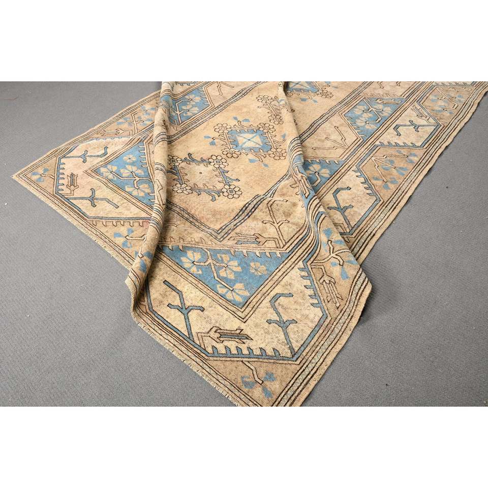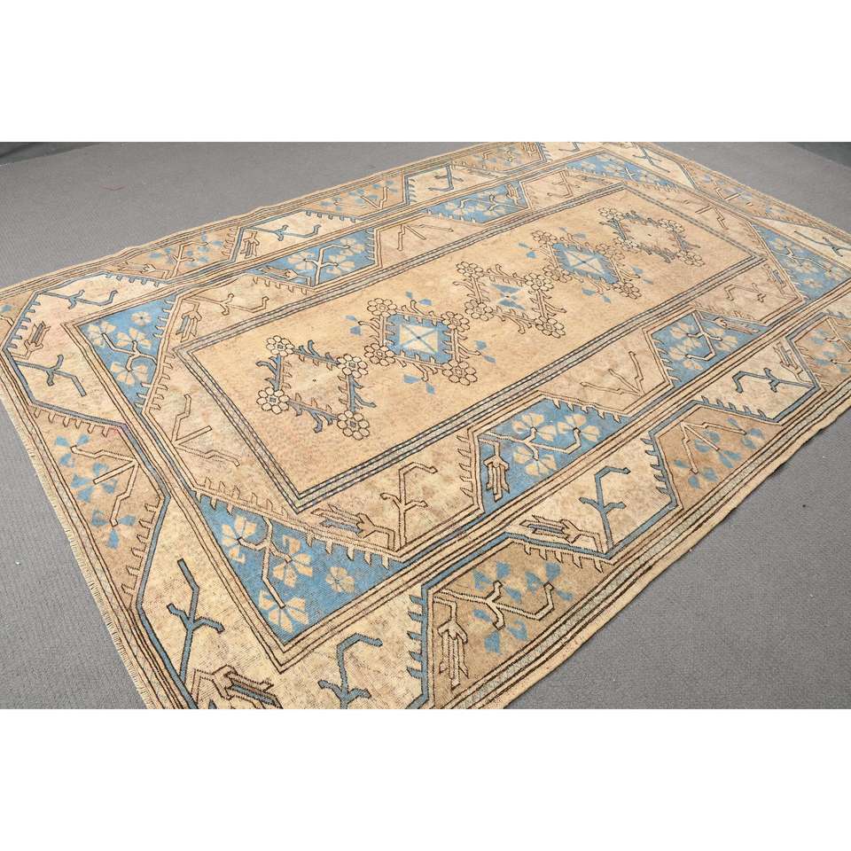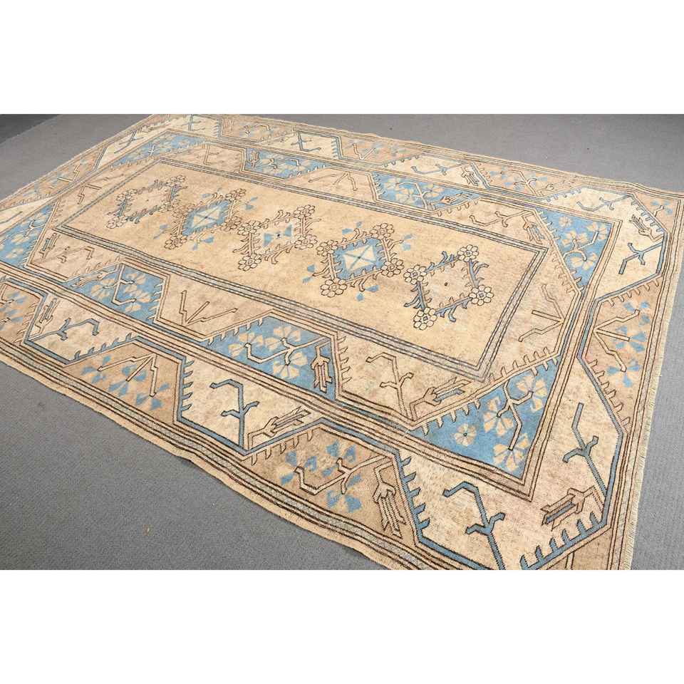 Grand tapis vintage 6,5x9,8 pieds, tapis oriental brun bleu en laine