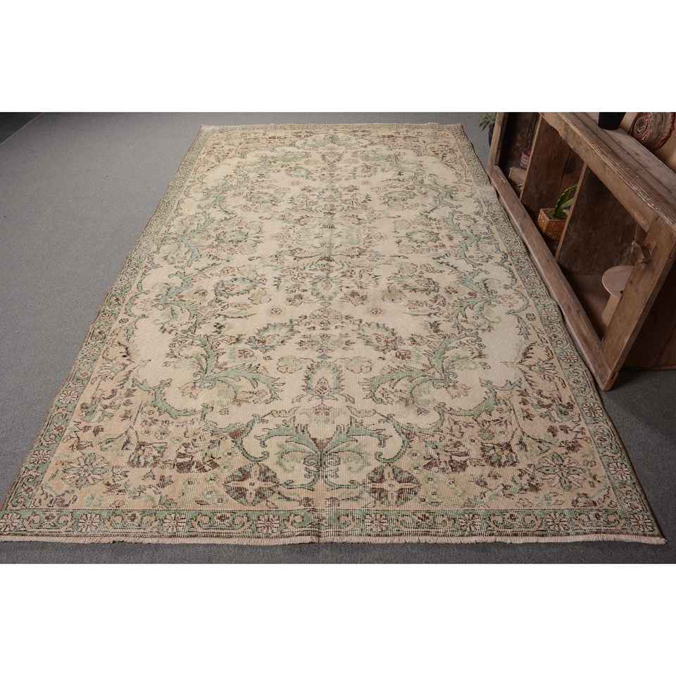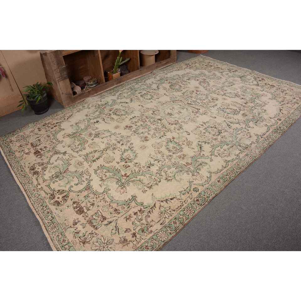 Tapis Vintage Oriental Beige Vert Laine 6.2 X 10.2ft Classique Turc Design À La Main Patchwork Rectangle Latex Support pour Adolescents
