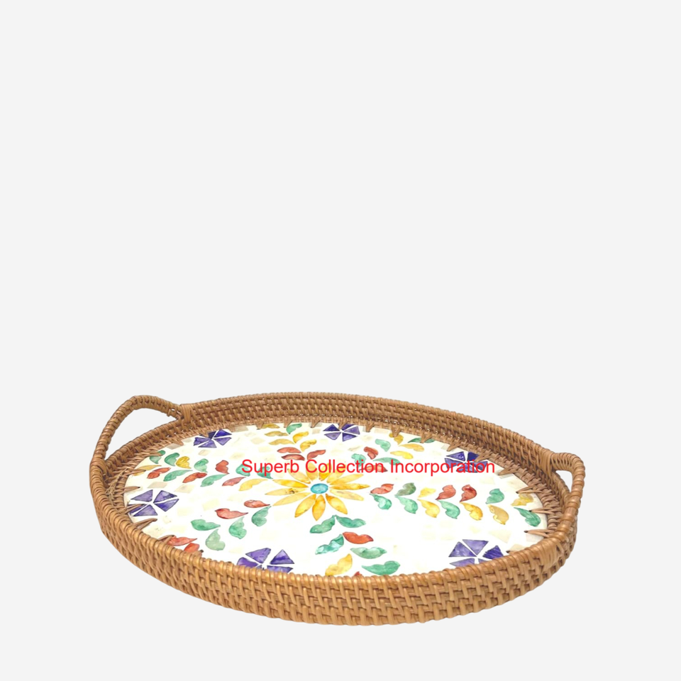 Plateau de service ovale vintage en rotin avec fleur élégante nacre plateau incrusté pour la cuisine et les repas écologique et fait à la main
