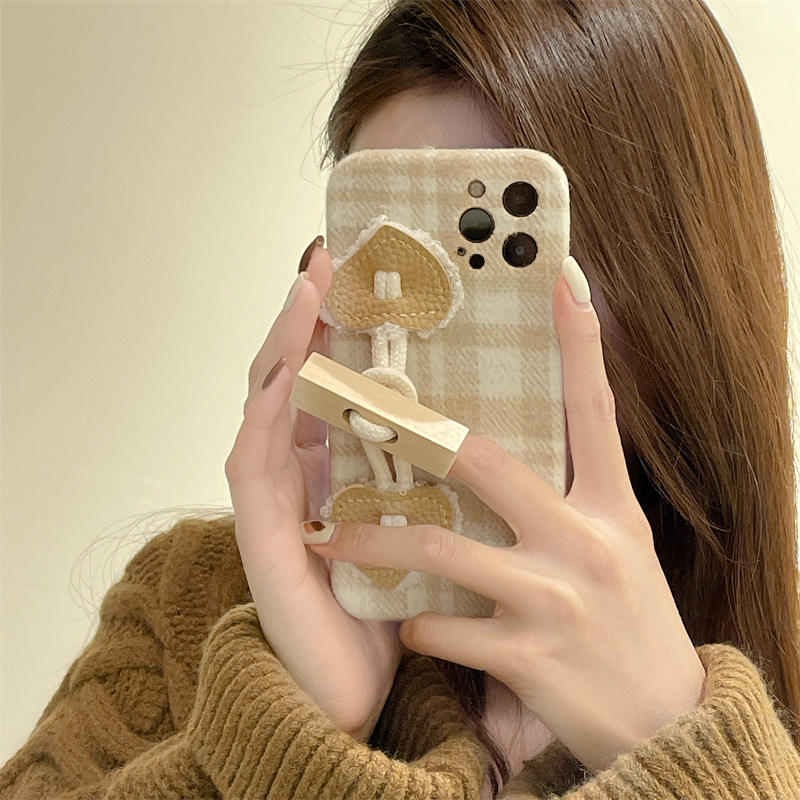 Vintage Plaid Heart Phone Case with Wooden Buckle Retro Fabric Phone Cover with Love Heart Decoration for Ipone 16/15/14 Pro Max