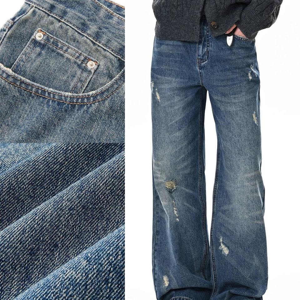 Vintage Retro Style Straight Jeans Pants Men and Women's Washed Worn Distressed Denim Mid Waist Commuting Leisure