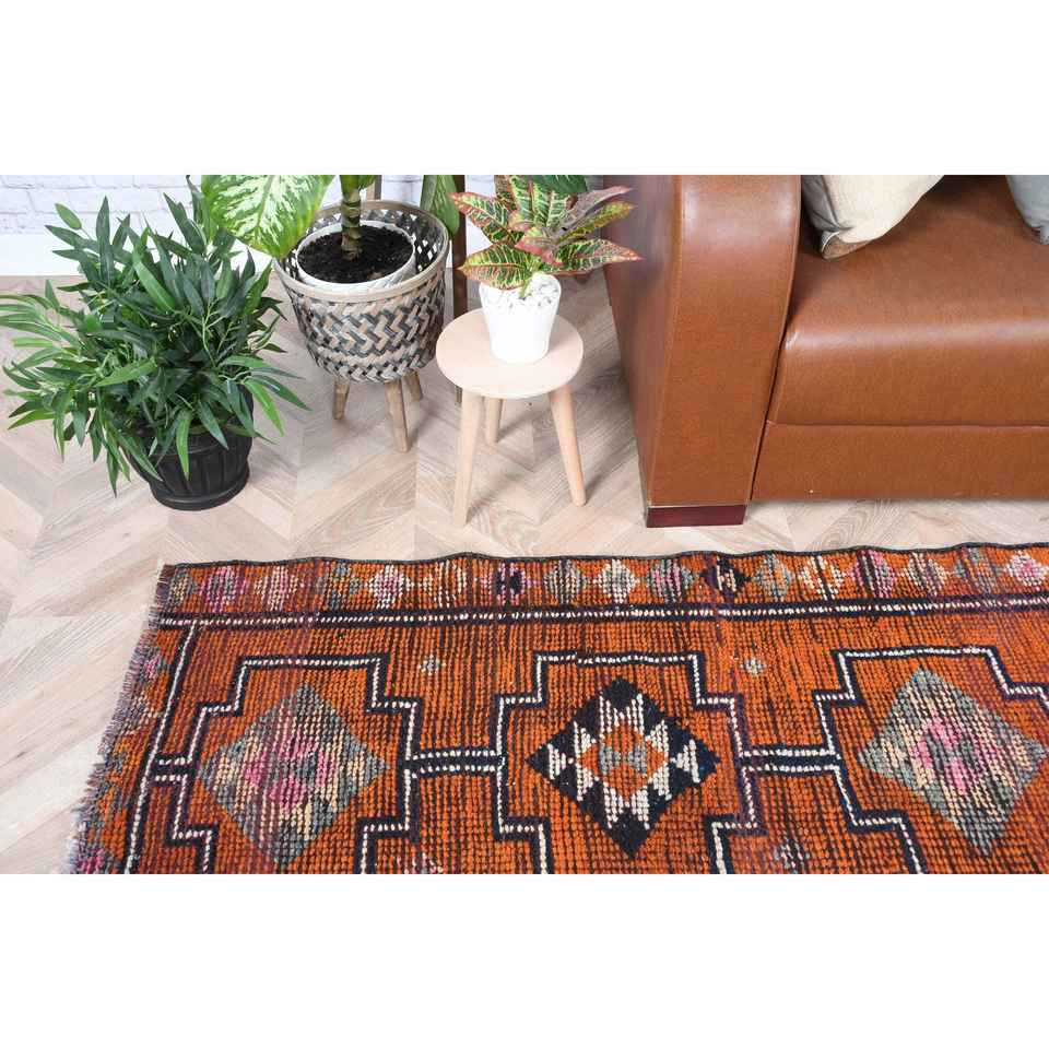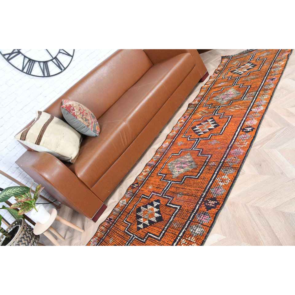 Tapis vintage 2,6x9 pieds, tapis turc en laine orange et noir à bordures