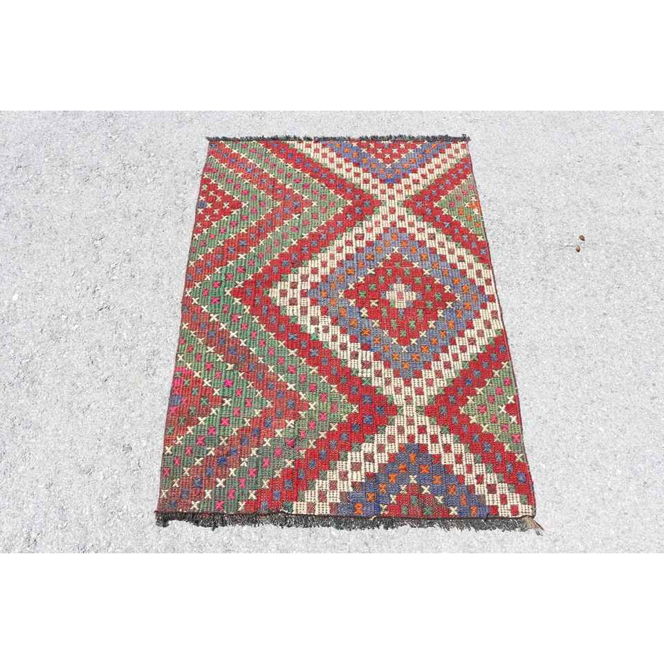 Vintage Turkish Wool Rug 2.7x3.8 ft Red Green Patchwork Design Eco-Friendly Latex Backing