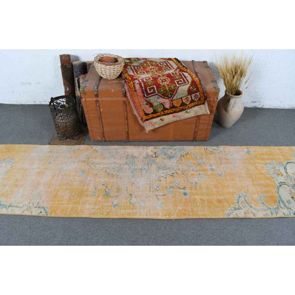 Tapis de couloir vintage 2,2x9,6 pieds, motif plantes et arbres jaunes, tapis en laine turque