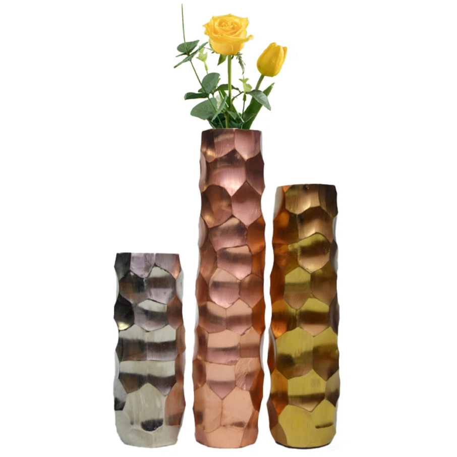 Vintage Custom Metal Design Flower Vase Set Large Hammered Floor Vase in Silver Rose Gold Gold Made in India Decorative