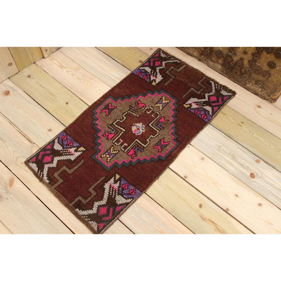 Petit tapis vintage 1,4x2,9 pi (44x87 cm), tapis turc en laine à imprimé animal brun