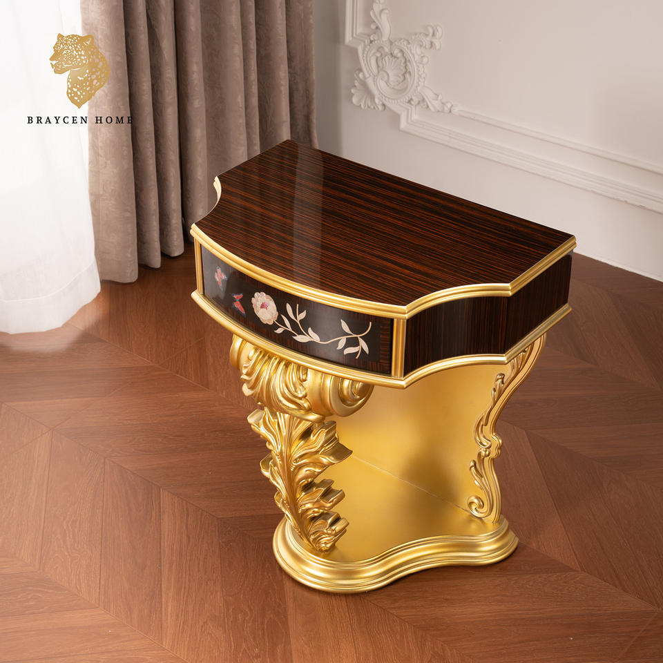 Table console vintage en bois massif - Table d'appoint décorative avec incrustations en feuille d'or et nacre, table sculptée pour entrée ou salon