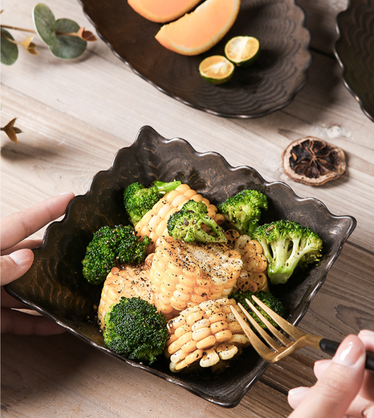 Service de vaisselle vintage rétro en grès, assiettes et bols carrés en céramique avec texture ondulée pour salade, steak, maison, cuisine, restaurant