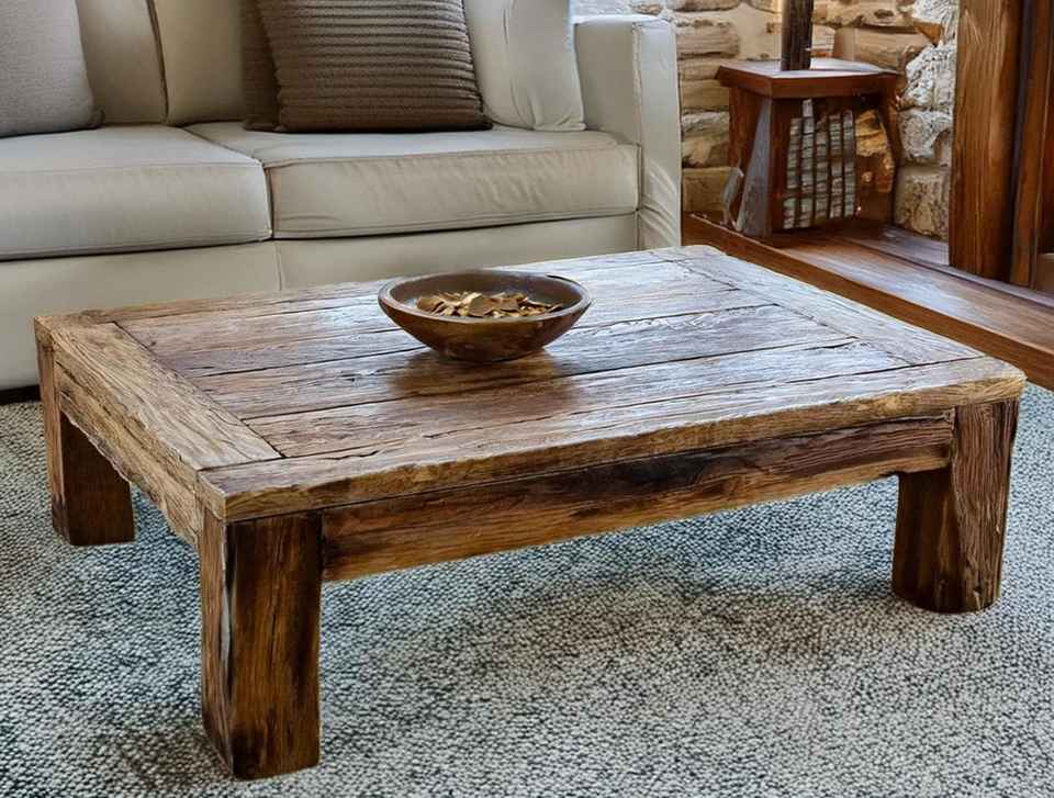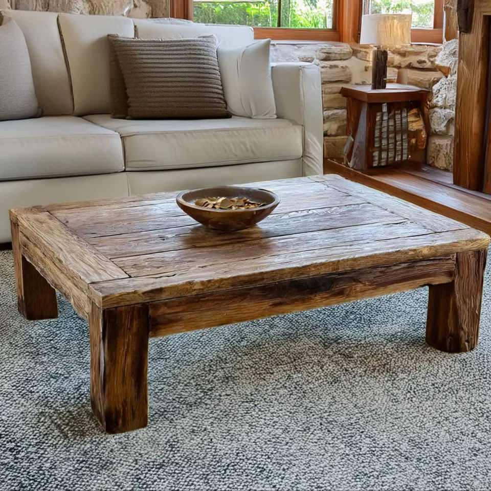 Table basse en bois massif de style vintage avec design à hauteur réduite, structure à cadre épais et finition à texture de grain rustique naturel