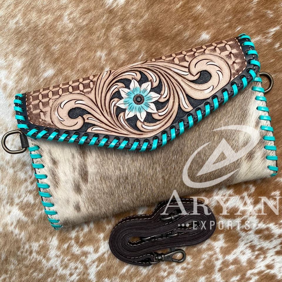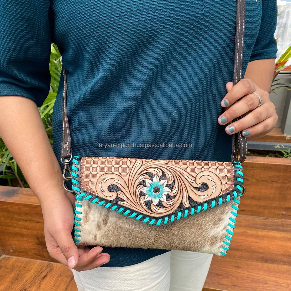 Enveloppe en cuir de vachette véritable usinée de style vintage Sac à main spacieux en cuir véritable Western Cowgirl Mini sac à bandoulière spacieux