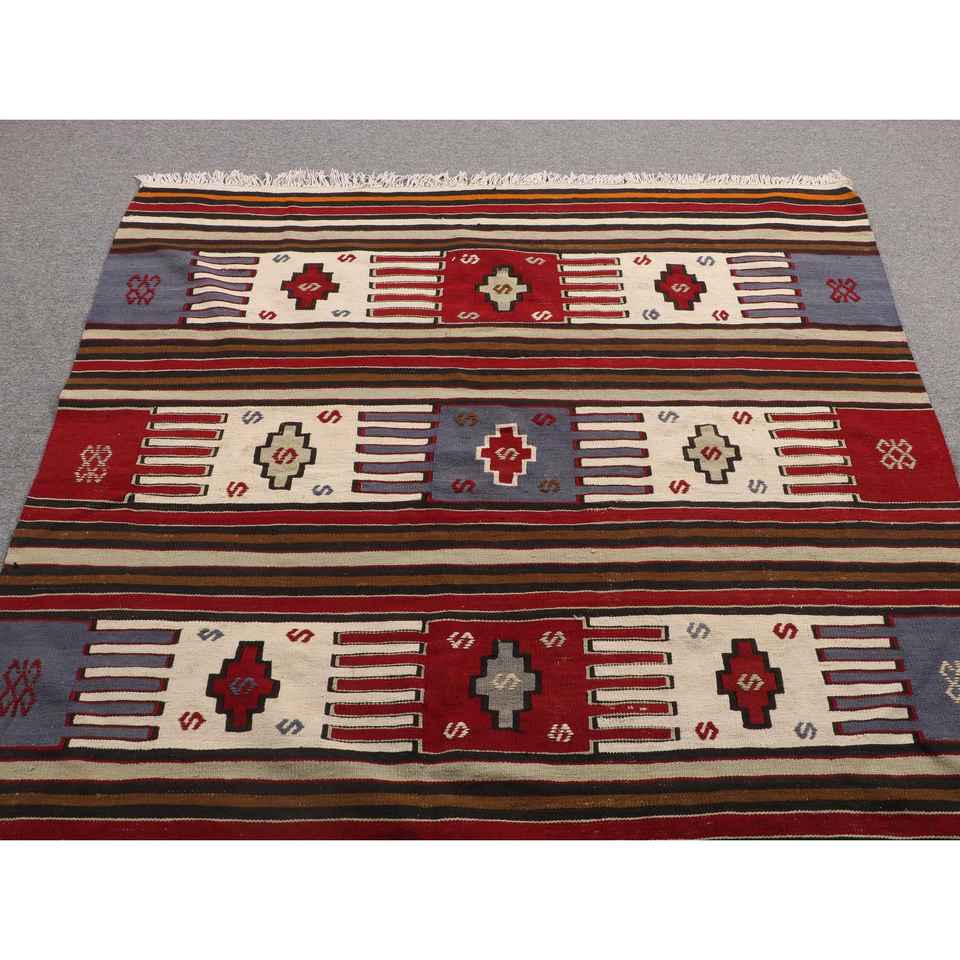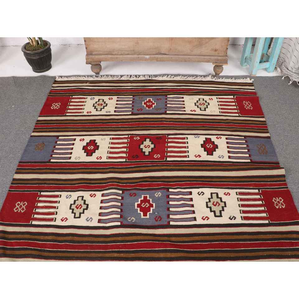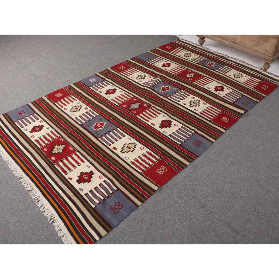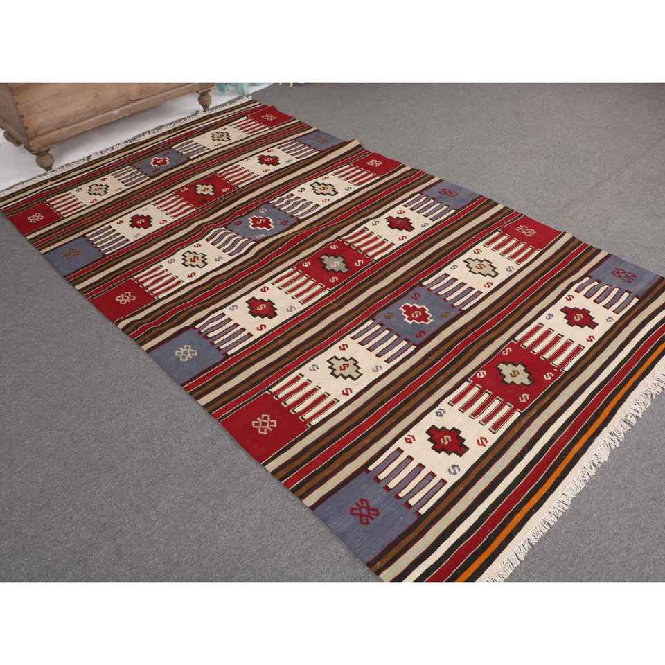 Tapis turc vintage 4,9x7,5 pieds, tapis en laine rouge et bleu à motifs floraux