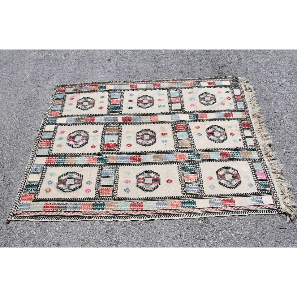 Vintage Turkish Kilim Beige Rug 3.8 X 5.2 ft Flat Weave Patchwork Pattern Wool Latex Backing for Teen Living Room Decorations