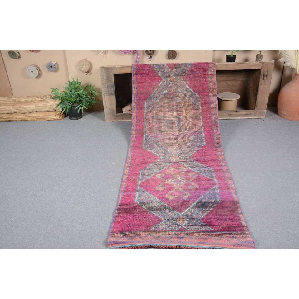 Tapis Kilim Turc Vintage 2,8X11 ft Rose Orange Fait à la Main Laine Latex Support Rectangulaire Motif Abstrait pour Chambre Couloir