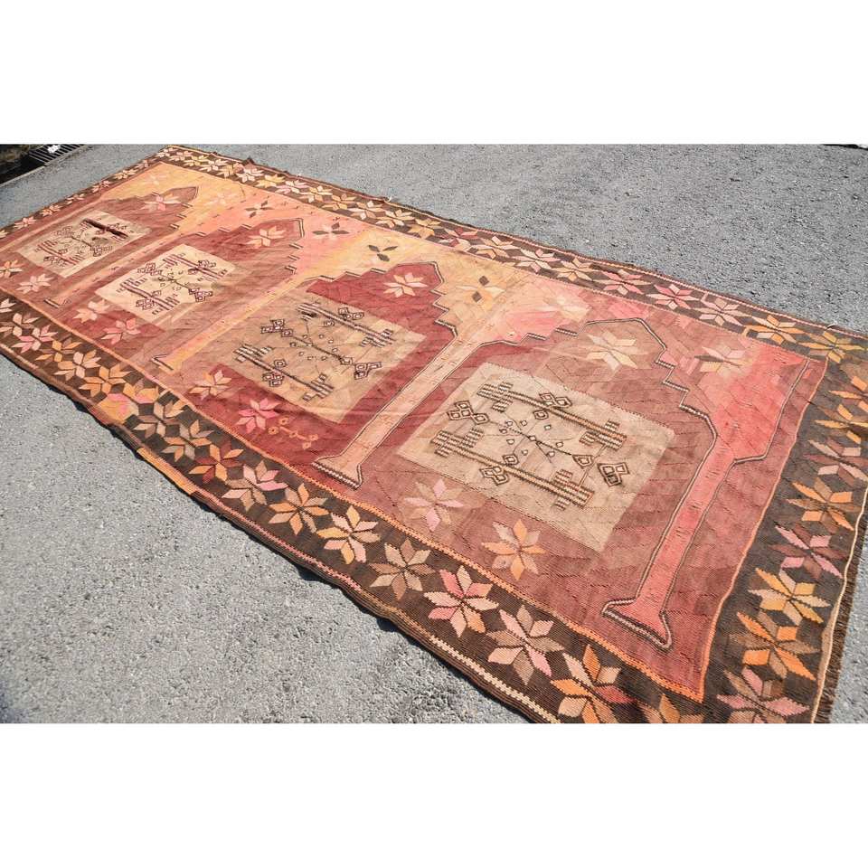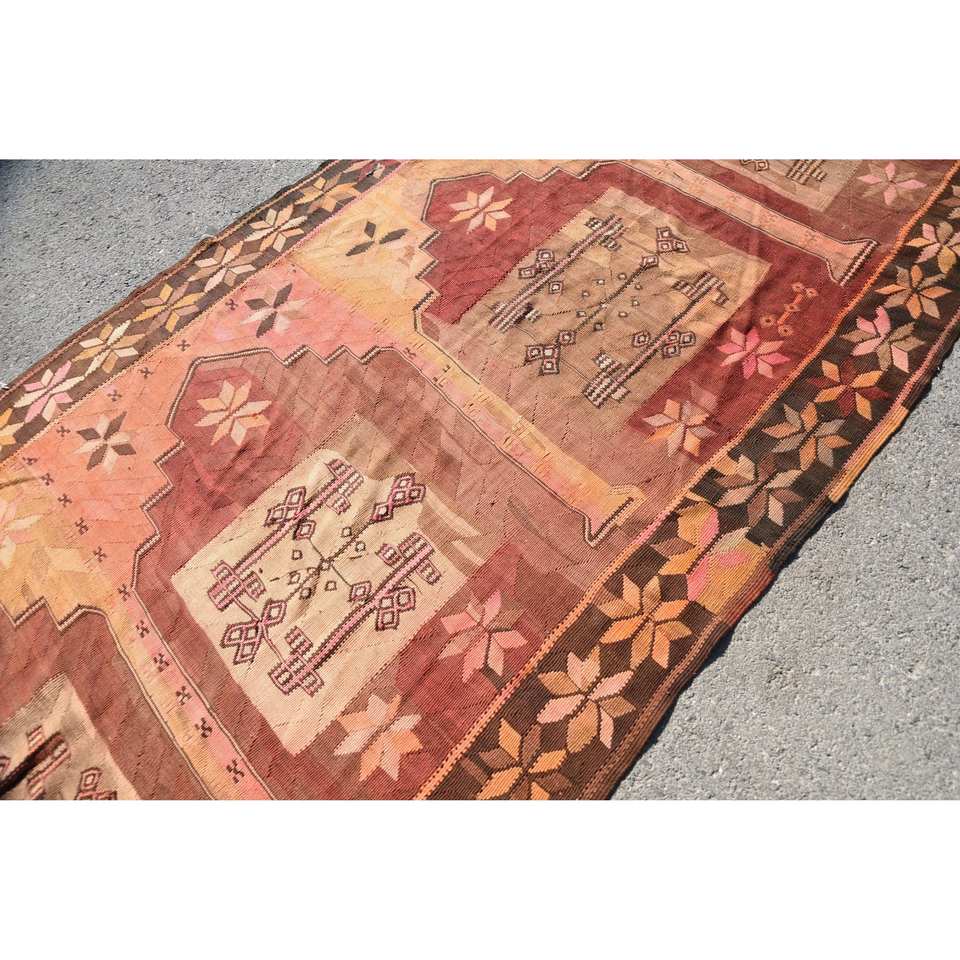 Tapis Kilim Turc Vintage 5.4 X 13.3ft Brun Orange Patchwork Design Plat Tissage Laine Jute Tapis pour Adolescents Rectangle Couloir Latex