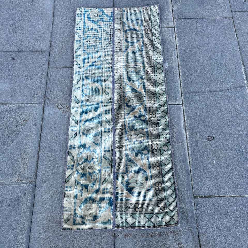 Tapis turc vintage 1,4x3,4 pi (43x105 cm), tapis floral bleu gris