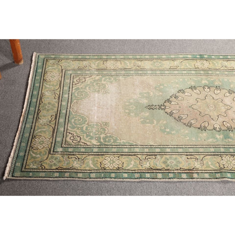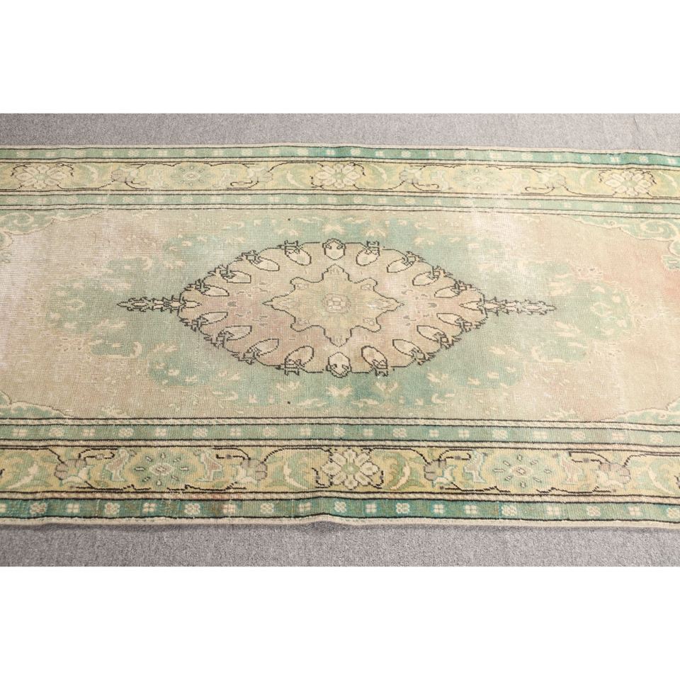 Tapis turc vintage, 2,8x6,3 pieds, vert beige géométrique avec éléments floraux