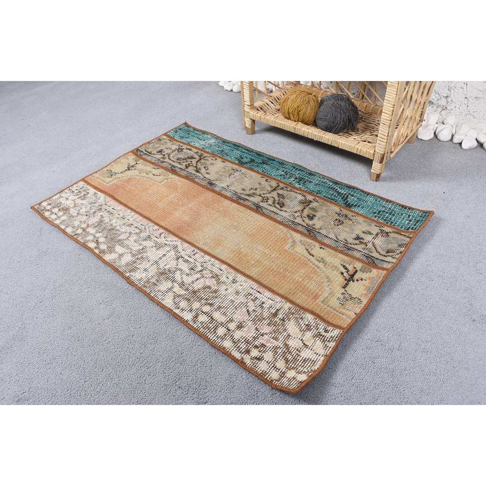 Tapis Turc Vintage (2X3 Ft) Écologique Latex Éclectique Brun Orange Patchwork Design Laine Tissage Plat Décorations de Salon