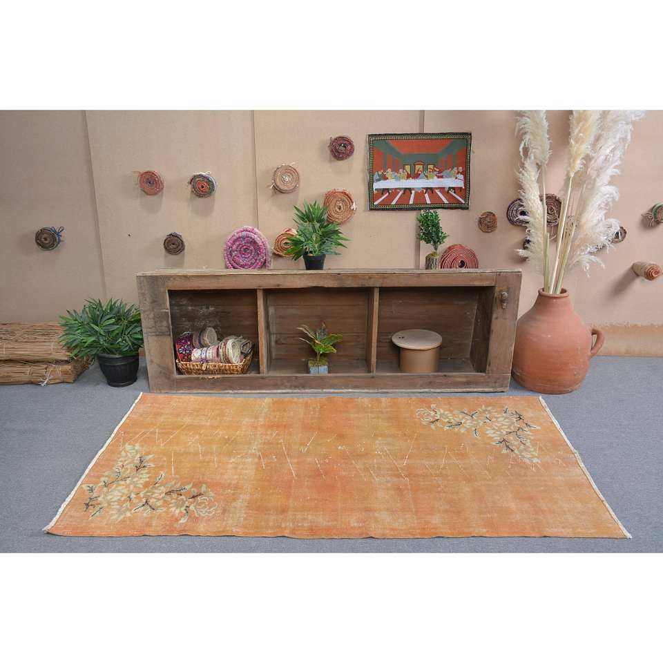 Tapis turc vintage 3,4 x 6,6 pieds, motif patchwork orange, en laine, latex, salle à manger, rectangulaire, écologique, poils moyens