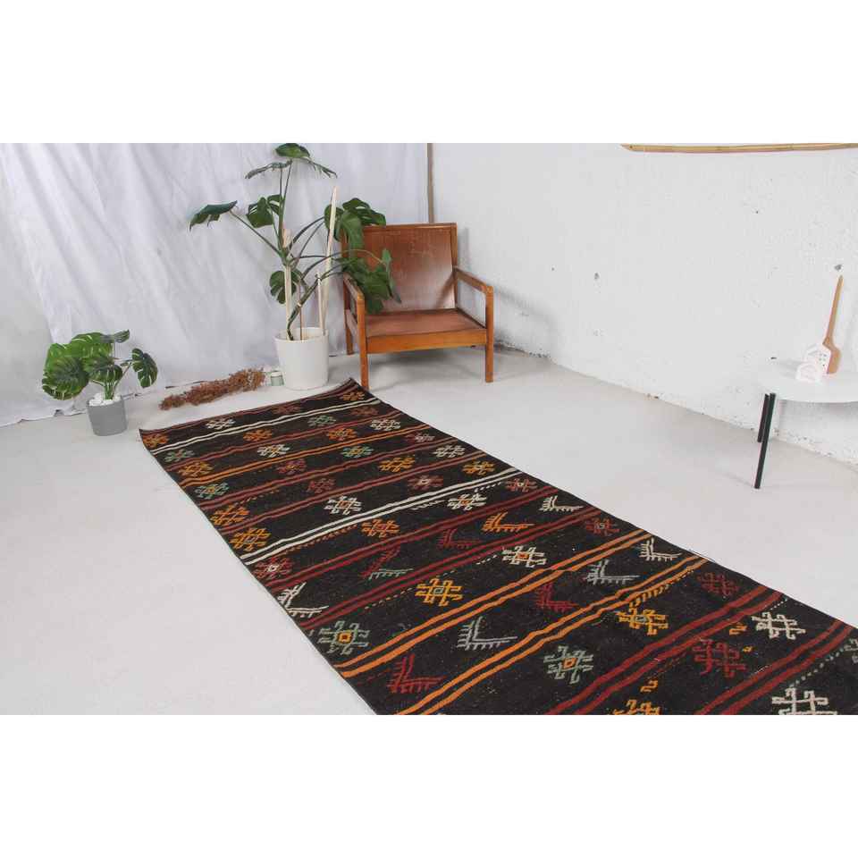 Tapis turc vintage, tapis de couloir 3,6x11,3 pieds, tapis en laine à carreaux noirs et rouges