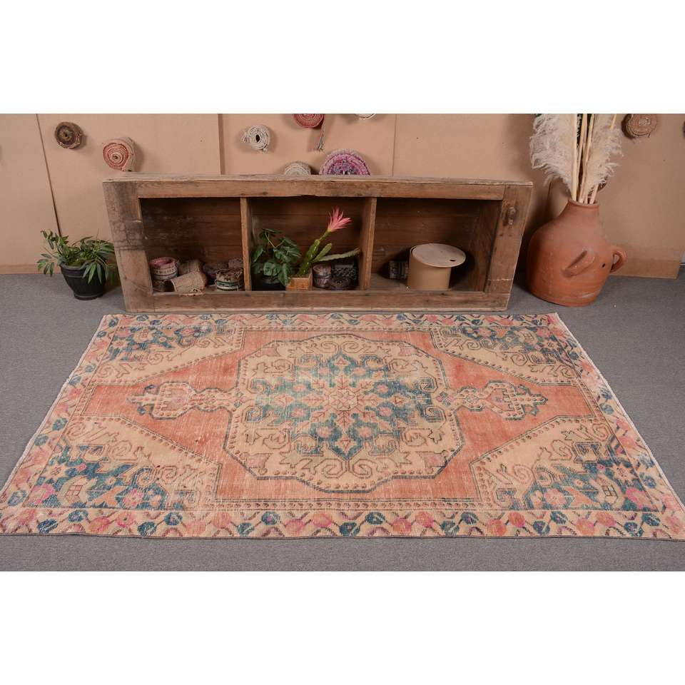 Tapis turc vintage 4.3x7 pieds Orange bleu Patchwork Design laine grande surface Rectangle zone pour adolescent abstrait Latex couloir chambre