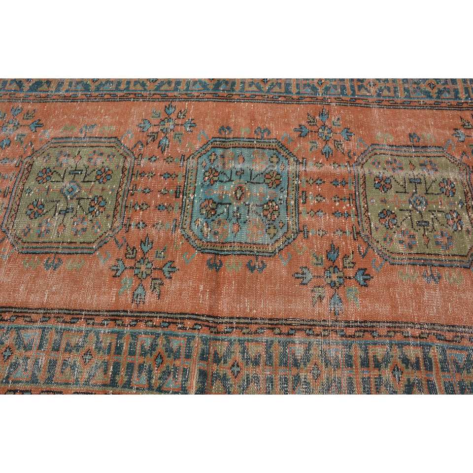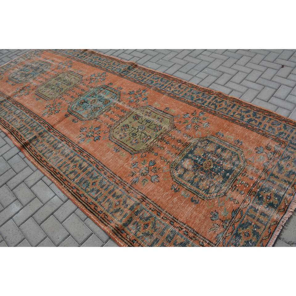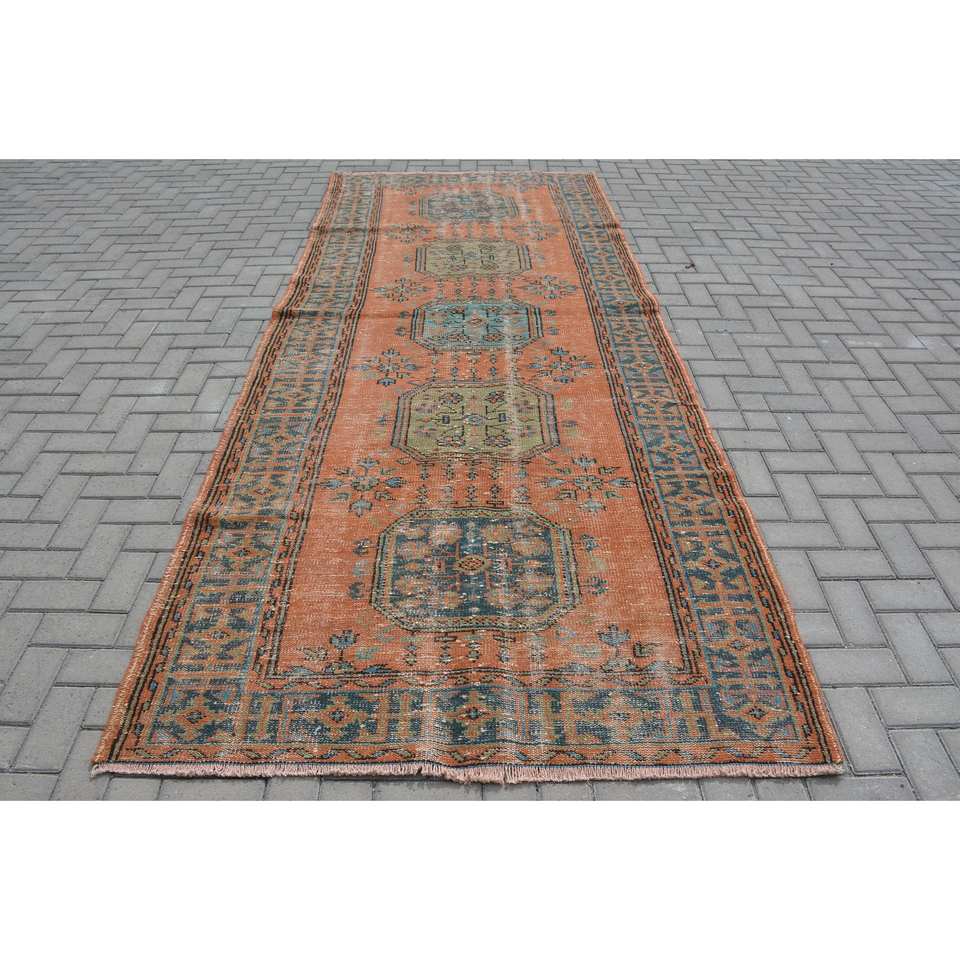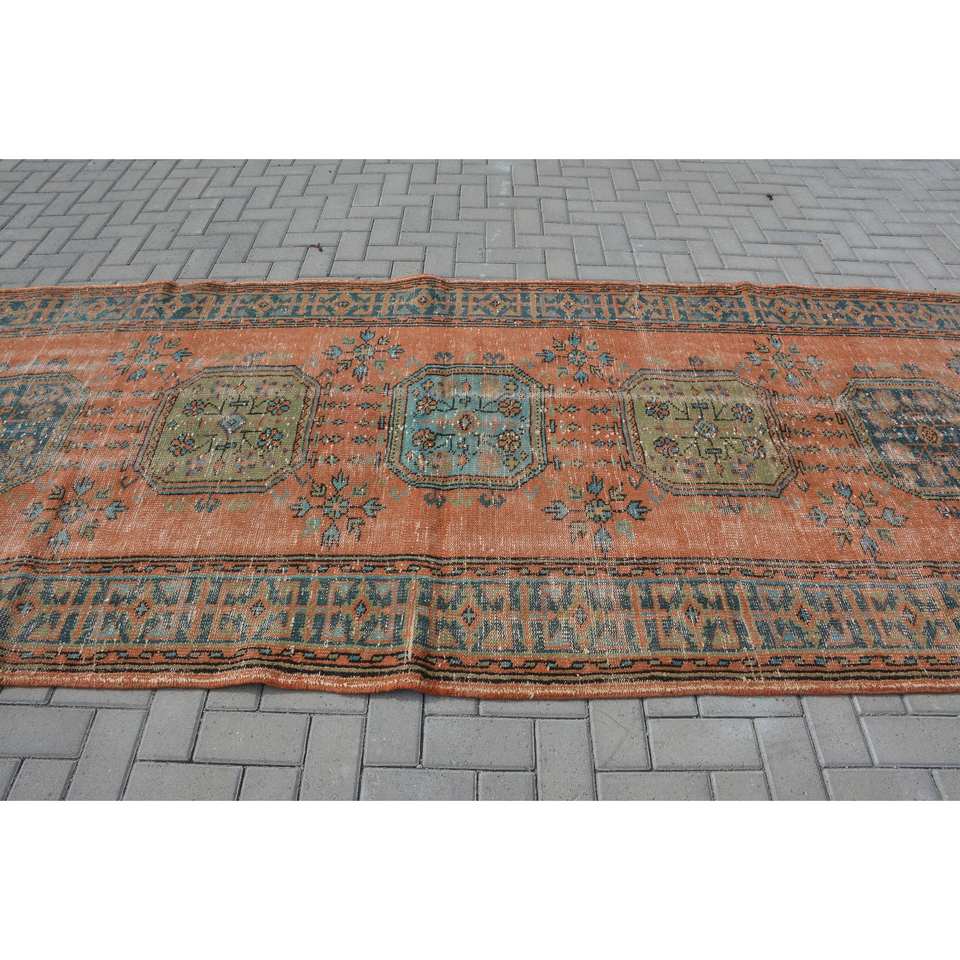 Tapis Turc Vintage 4.8x 11.8ft Orange Bleu Patchwork Design Laine Matériau Latex Style-Tabriz pour Entrée Rectangle Abstrait