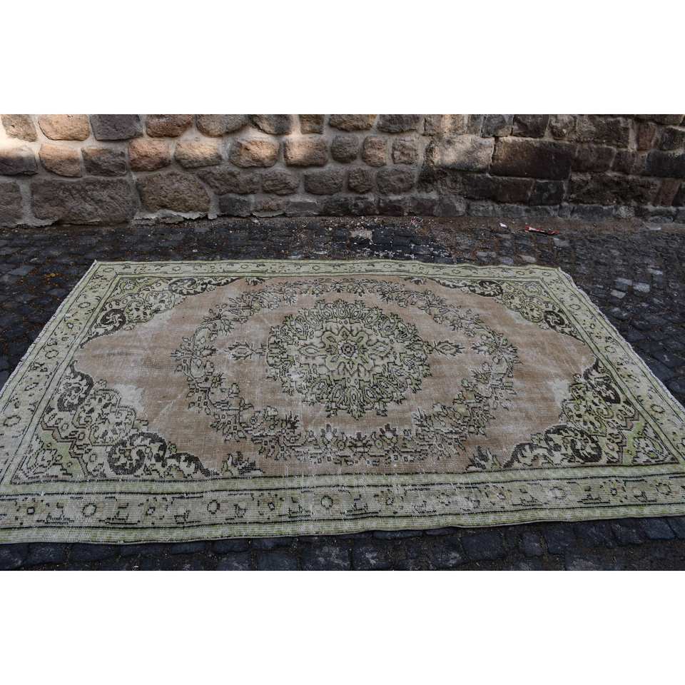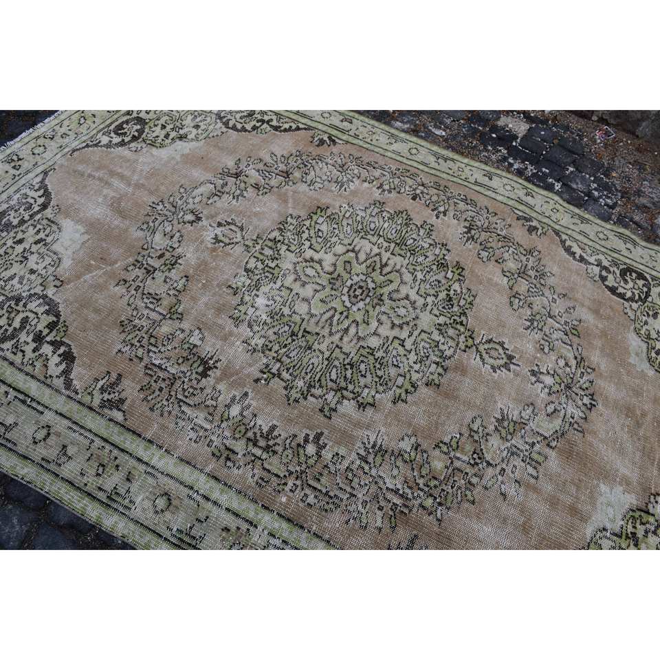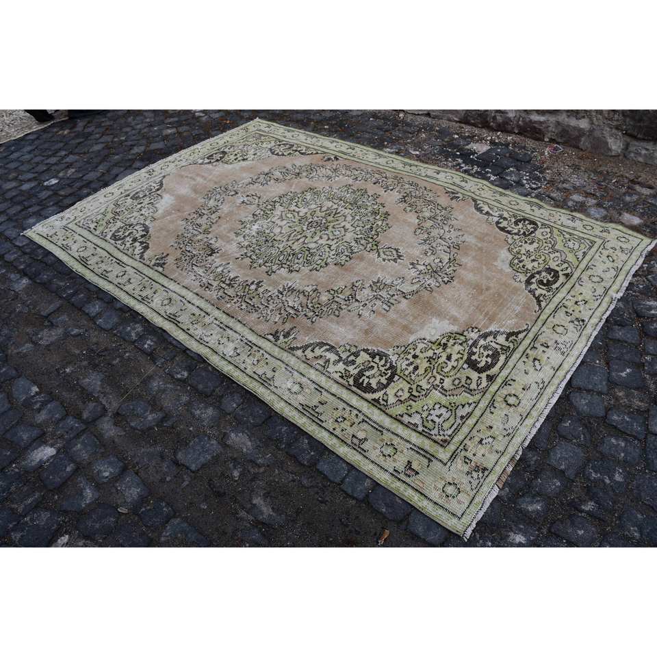 Tapis Turc Vintage 5.7 X 8.7ft Beige Vert Laine Patchwork Latex Soutenu pour Salon Couloir Adolescent Chambre Rectangle Rayé