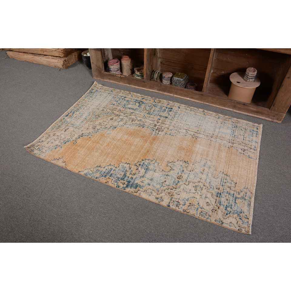 Tapis Vintage Turc Beige Bleu 3.3 X 5ft Laine Grande Surface Motif Abstrait Forme Rectangulaire Peluche Pile Latex pour Couloir
