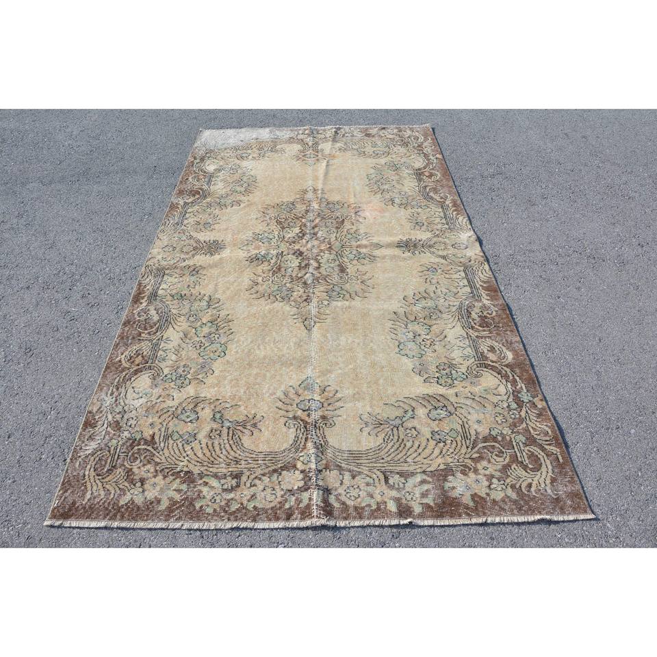 Tapis turc vintage en laine tissée à plat beige-marron de 5,2x9,2 pieds avec motif patchwork pour les décorations de salon ou le couloir