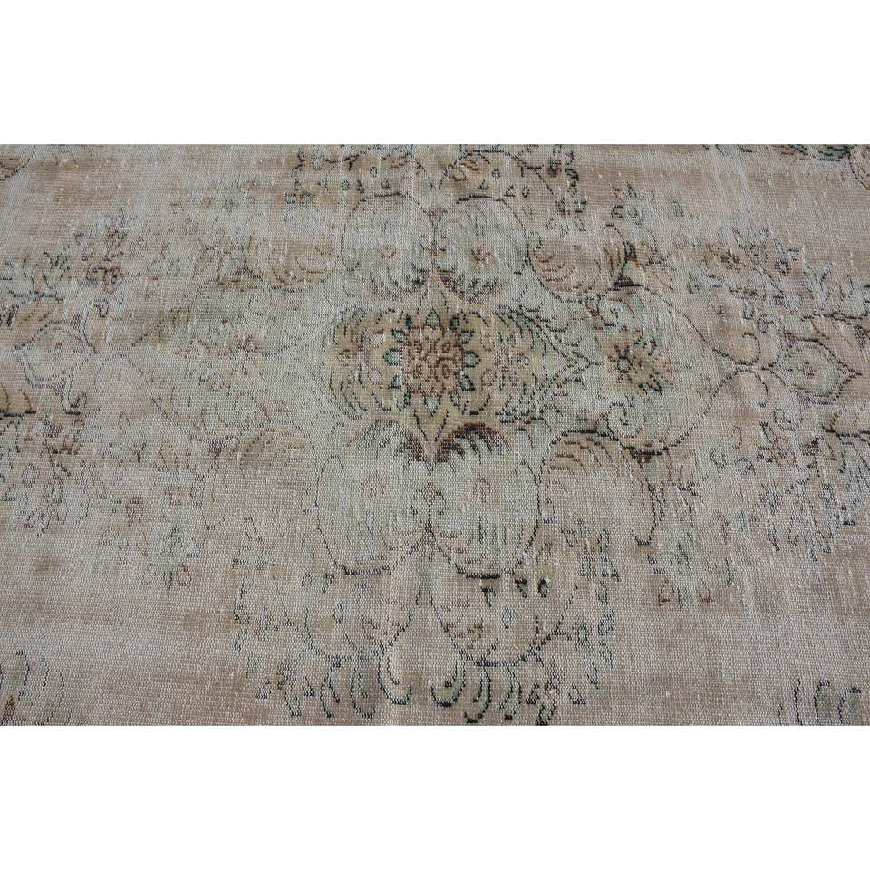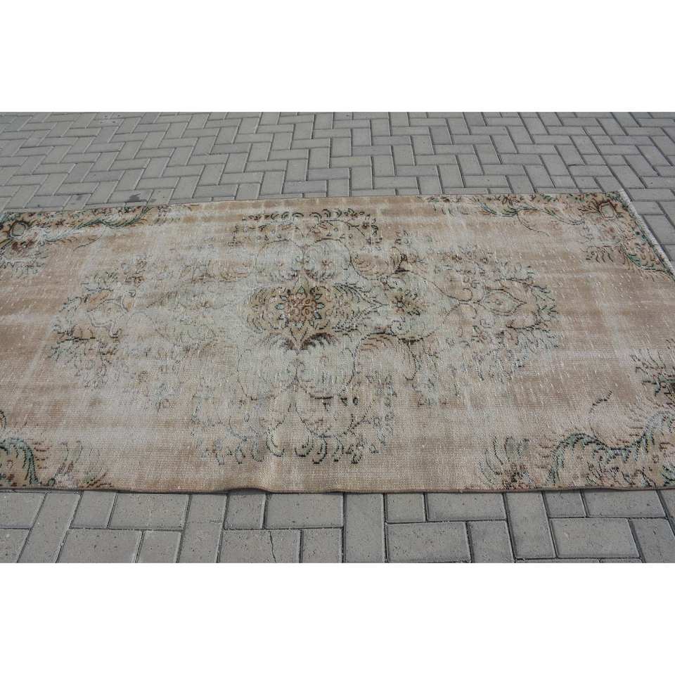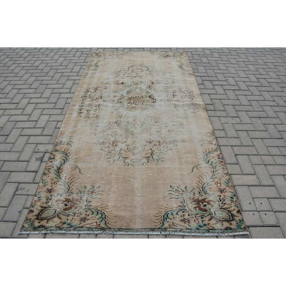 Tapis turc vintage beige et vert 4,5x9,1 pieds en laine, tissage plat, motif patchwork, latex écologique pour décorations de salle à manger