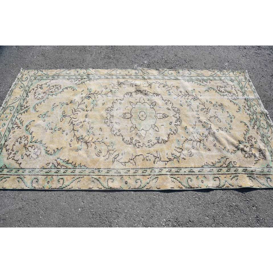 Tapis Turc Vintage Beige et Vert Motif Floral 4.2X7.8 ft Laine Matériau Latex Support pour Décorations de Salon