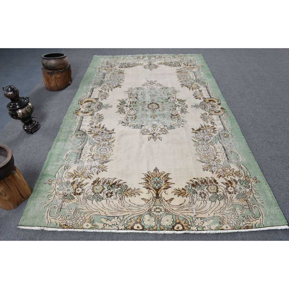 Vintage Turkish Rug Classic Green Beige 5.4 X 9.2ft Handmade Plush Rectangle Area Rug for Teens Abstract Pattern for Hallway New