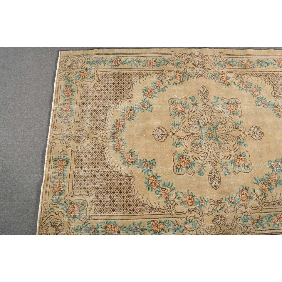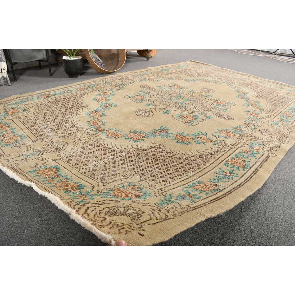 Tapis turc vintage, respectueux de l'environnement, en latex beige brun, laine, tissage plat, motif patchwork, traditionnel, 5,2 x 7,9 pieds, salon, couloir