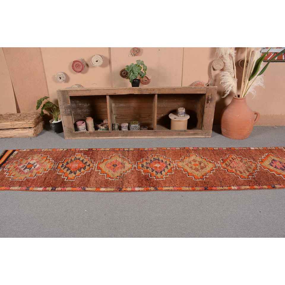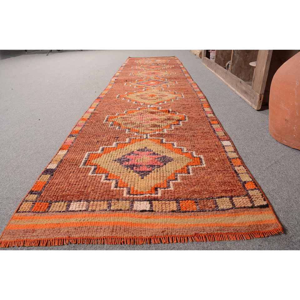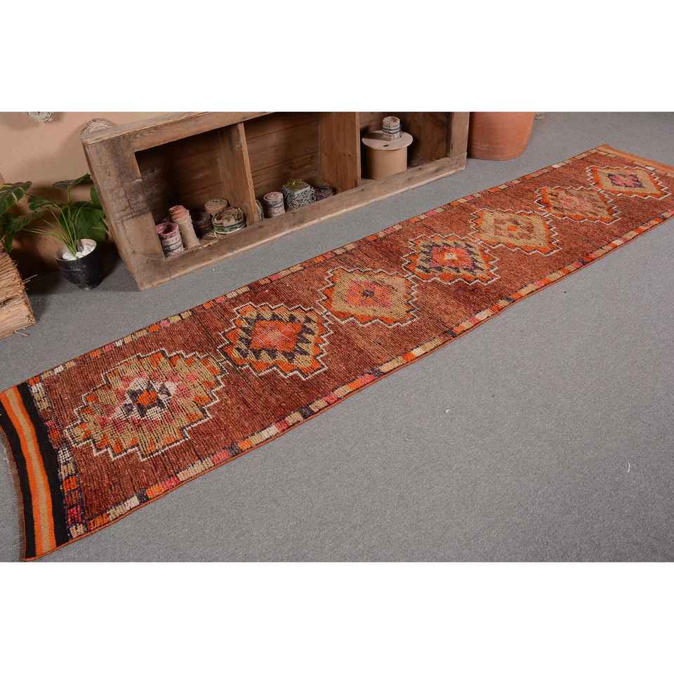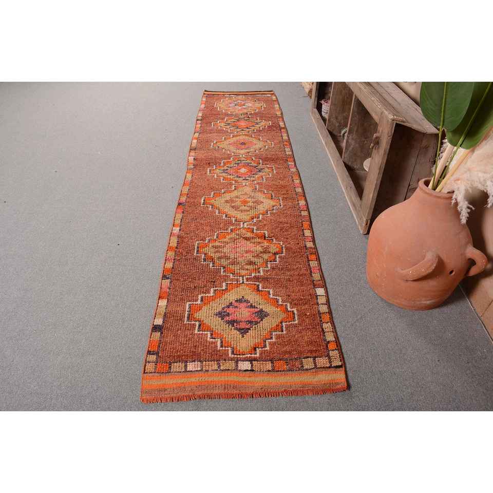 Tapis Turc Vintage Ethnique Marron Orange Patchwork Design Style Classique 2.4x11ft Laine avec Support en Latex pour Décoration de Chambre Adolescente