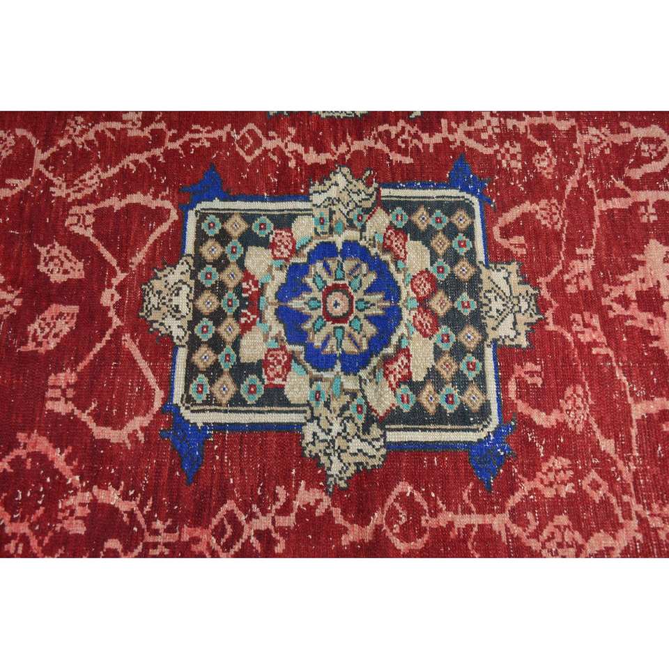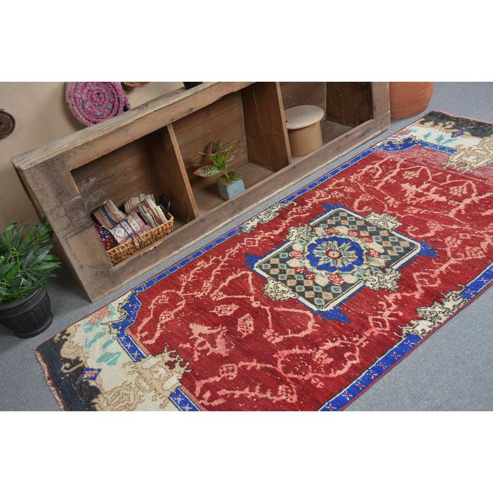 Tapis turc vintage, grande surface, 3,3 x 7,8 pieds, écologique, design classique rouge et bleu patchwork, laine 10 mm, latex, forme rectangulaire